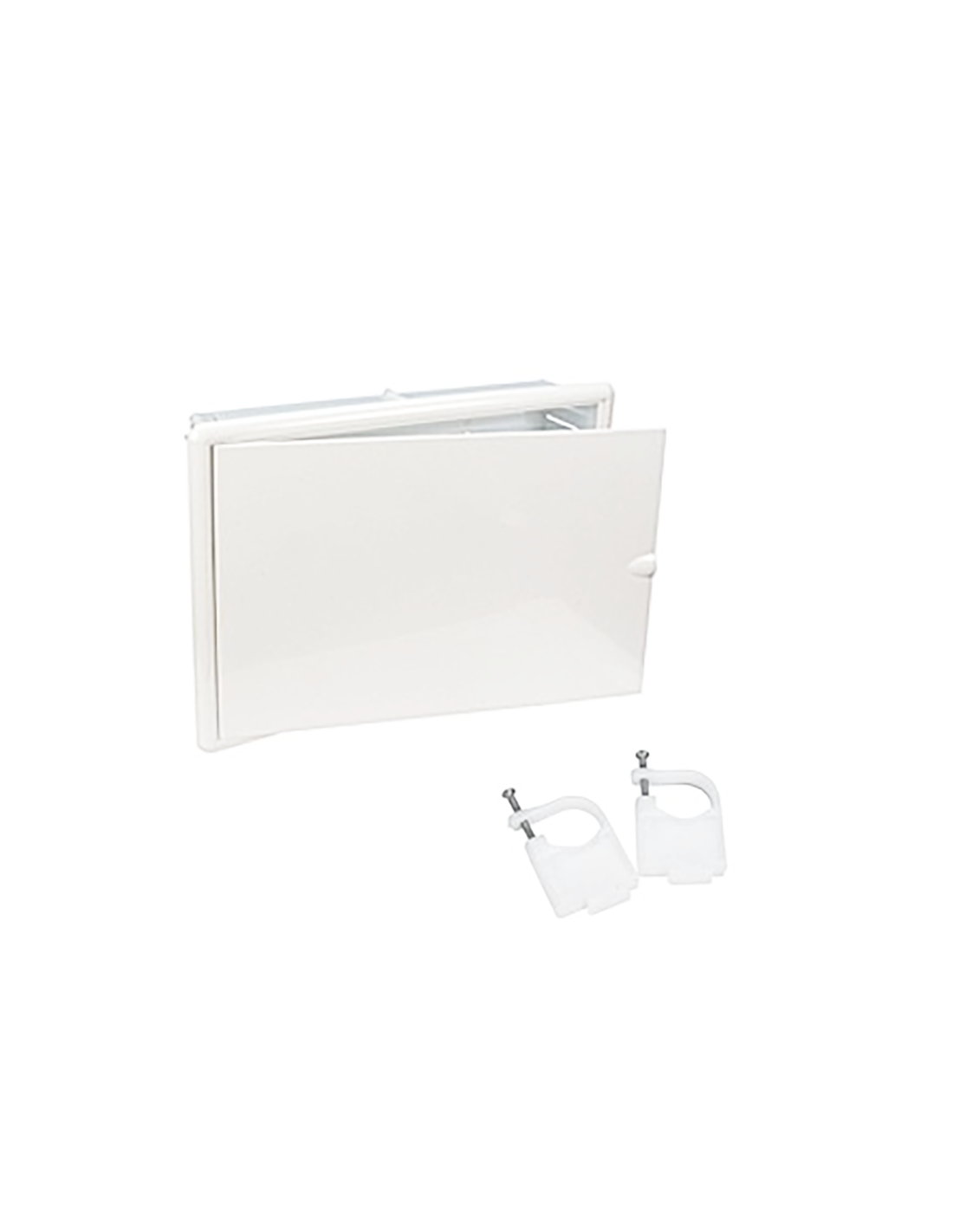 Cassetta in plastica, con portello e telaio. Chiusura portello ad aggancio rapido senza fissaggio con viti. Per collettori R580C, R585C.
